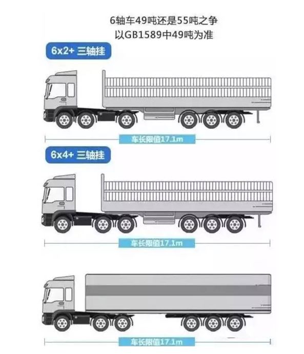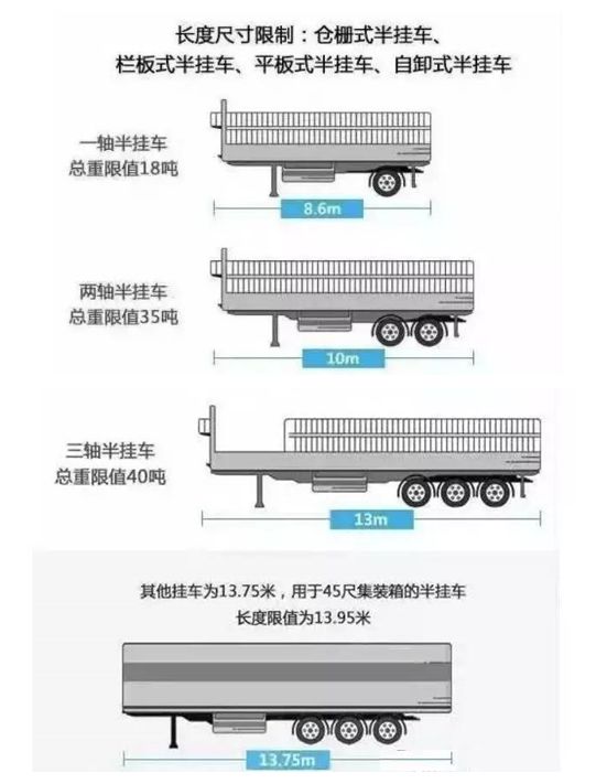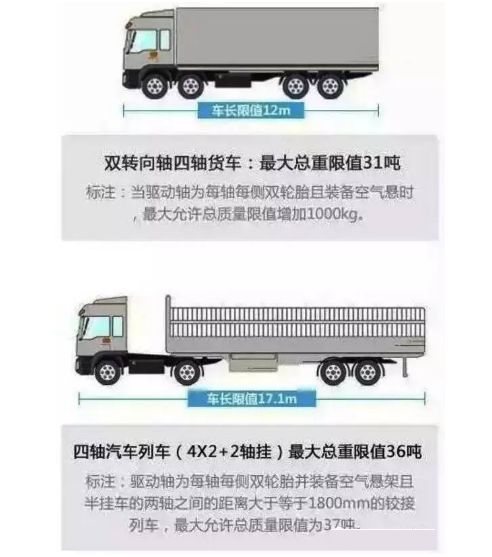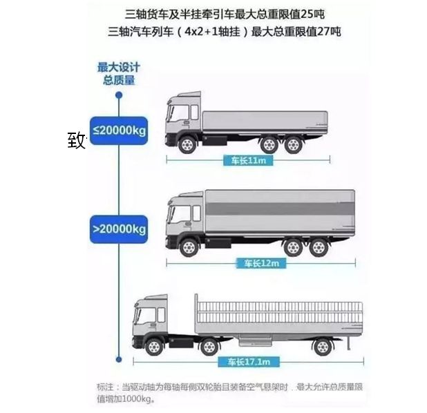 ➤➤➤首先,在重量超限认定上:2轴货车车货总重不得超过18吨;3轴货车不得超过25吨,3轴汽车列车不得超过27吨;4轴货车不得超过31吨,4轴汽车列车不得超过36吨;5轴汽车列车不得超过43吨;6轴及6轴以上汽车列车不得超过49吨,其中牵引车驱动轴为单轴的,其车货总质量不得超过46吨。