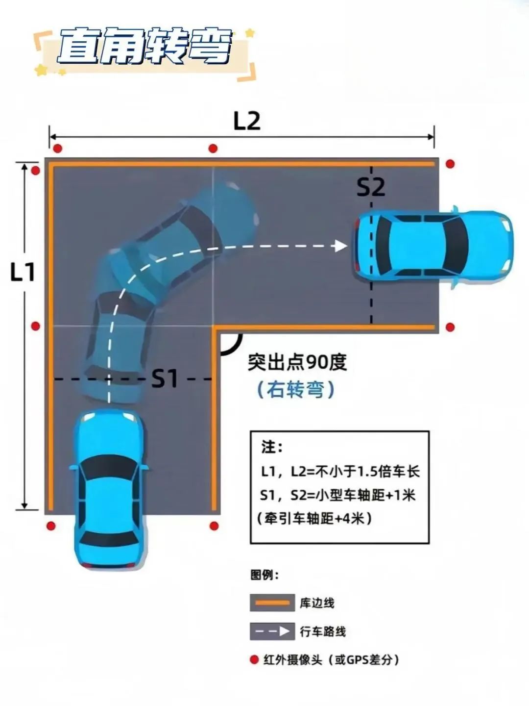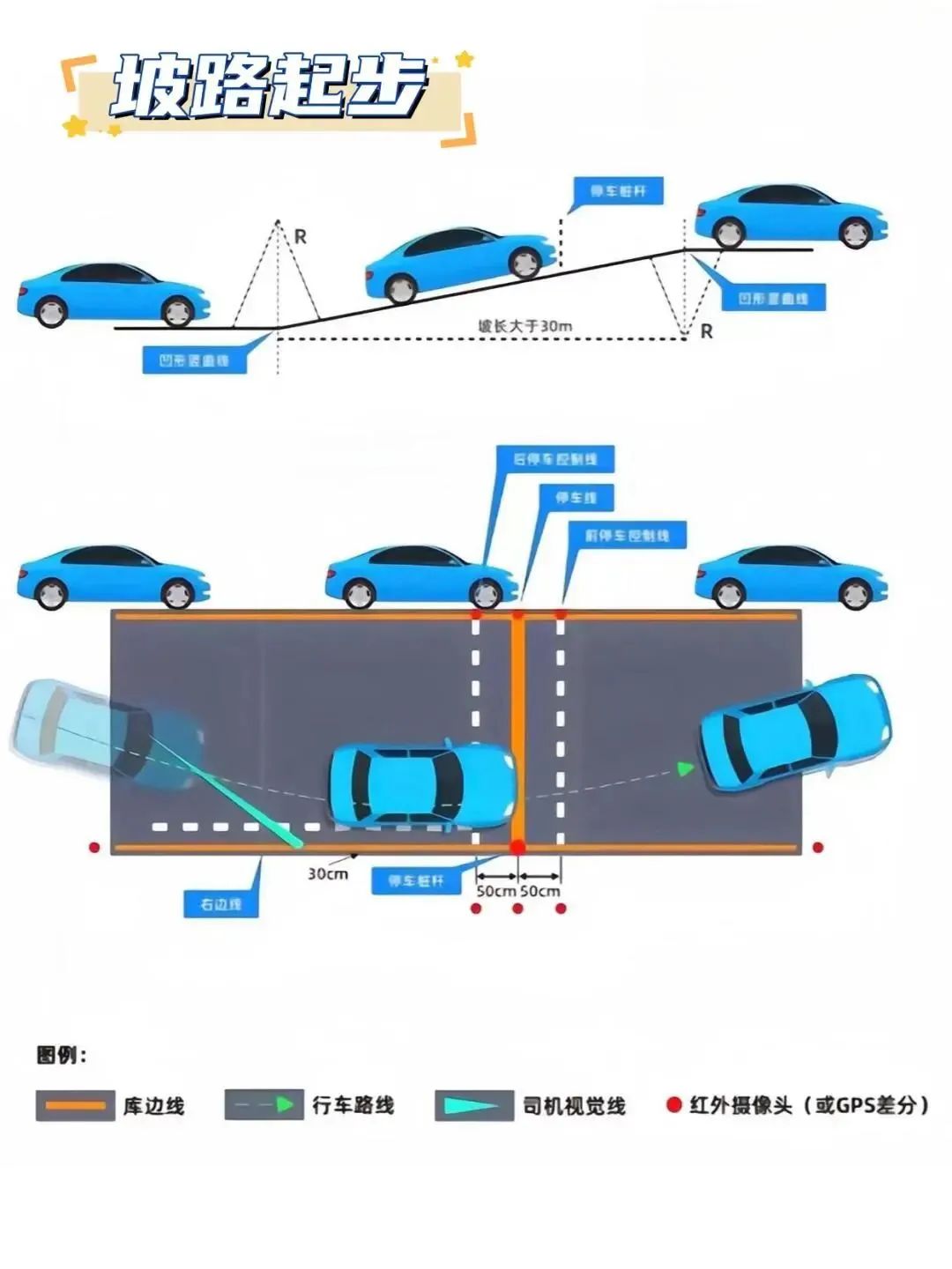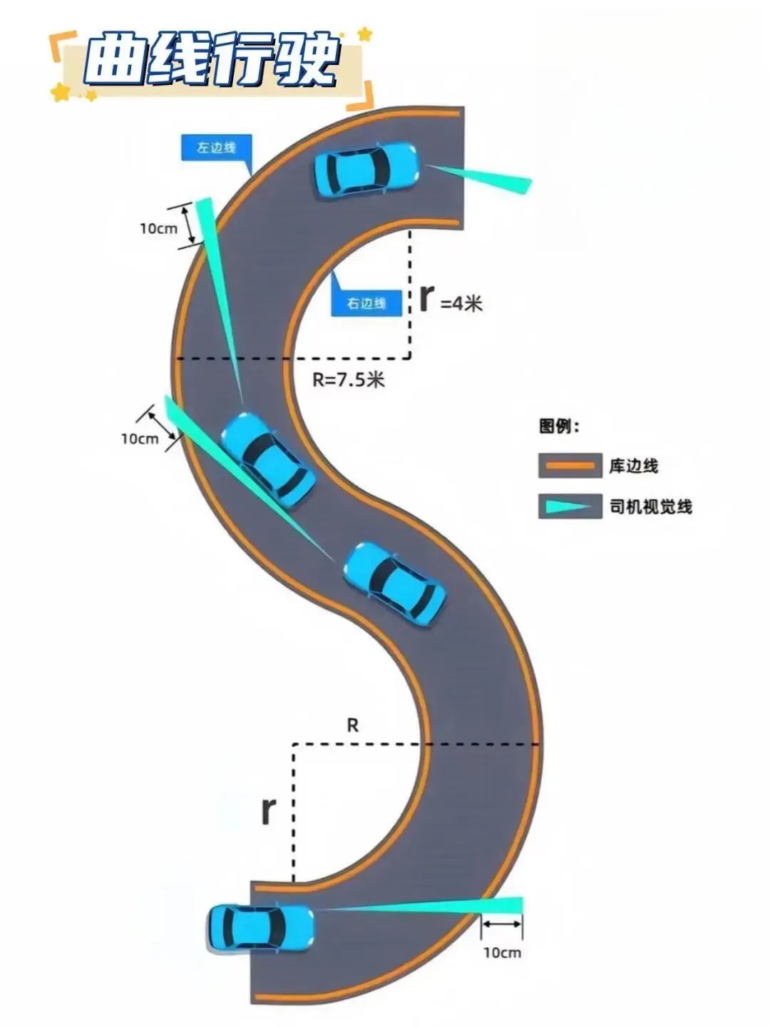 侧方位停车 侧方停车要记清,领线三十慢慢行。 右镜消失就停车,倒车看准第一个。 库角出现回方向,车轮压线再打死。 车身平行就回正,出库记得打转向。 曲线行驶 曲线行驶很简单,车头沿着线走边。 左弯靠右右弯左,方向微调别慌乱。 速度均匀心态稳,轻松通过很自然。 直角转弯 直角转弯不太难,提前开启转向灯。 靠线三十是关键,门把手对内角线。 方向打死要果断,车身正了快回正。 坡道和起步定点停车 坡道起步有难度,离合刹车要稳住。 上坡对准右边线,三十距离把握好。 定点停车看标杆,离合刹车一起踩。 起步慢松离合器,抖动强烈松刹车。