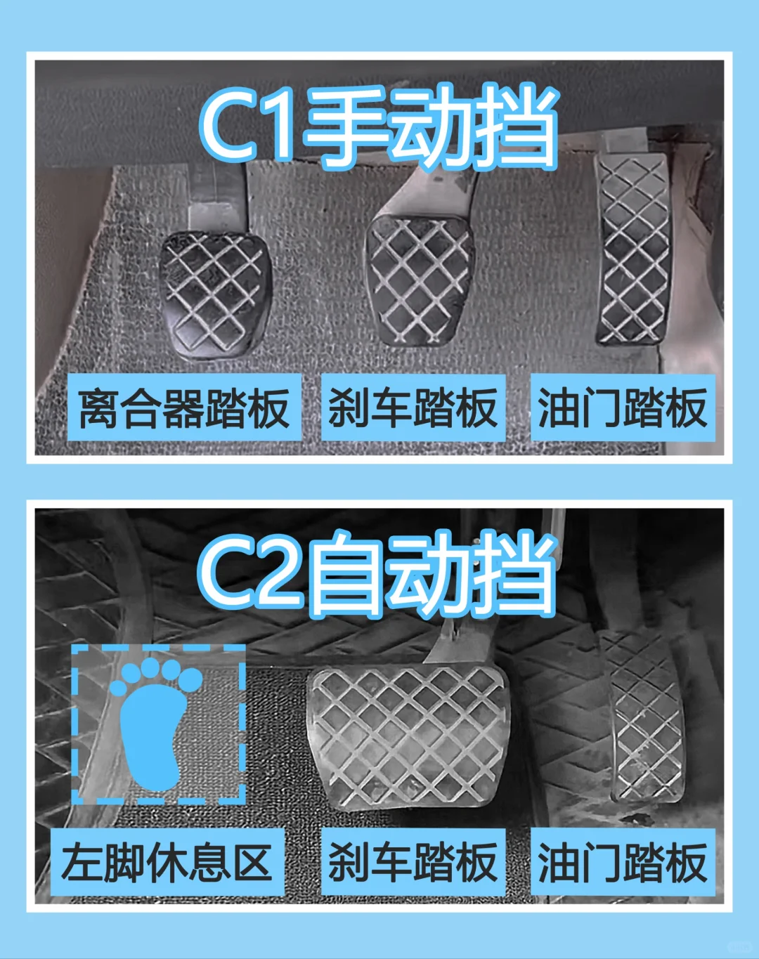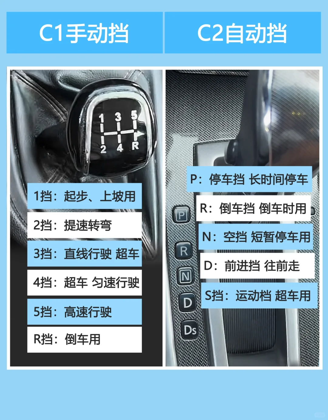 C1手动挡和C2自动挡 1、手动档的汽车在驾驶的时候需要根据车速不停地换挡,而自动档则很舒服,档位是自动切换,这也是手动档和自动挡最大的区别。 2、起步的时候手动挡的汽车需要踩下离合和刹车,然后挂上一档后丢下刹车和离合慢慢启动,自动挡则很简单,只需要挂上D档后给油门即可起步,手动挡会存在熄火的情况。 3、手动档的车在停车的时候需要同时踩下离合和刹车,然后减速停车,停车后挂入空挡,而自动档的则无需更多的操作,只需要踩刹车到停止,然后挂入P档即可。 4、自动档只需给足油门超车,而手动档要选择降档依次来获得更大的动力,这样可以实现快速超车。
